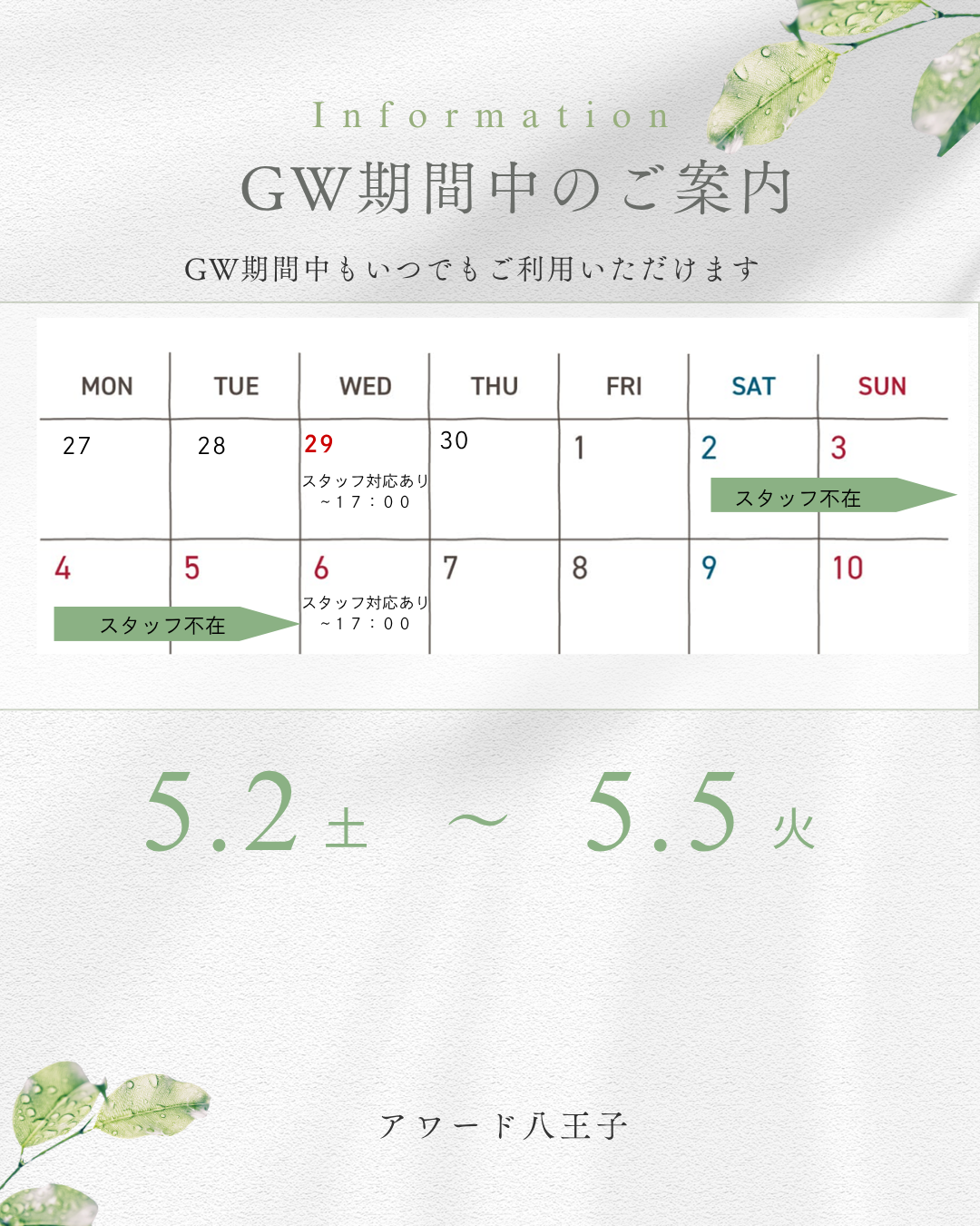 🌸 GWもアワード八王子はいつでも使えます! GW期間中、スタッフは一部お休みをいただきますが、施設は24時間通常通りご利用いただけます✨ ■ スタッフがいる日 4/29(昭和の日)・5/6(祝)〜17:00まで ■ スタッフ不在の日 5/2(土)〜5/5(火) ※補充・清掃のため店内にいる場合もあります 🏋️ マシンの使い方レクチャーをご希望の方は、専用予約サイトからご予約ください(ゲスト予約OK) GWこそ、自分時間を大切に💕